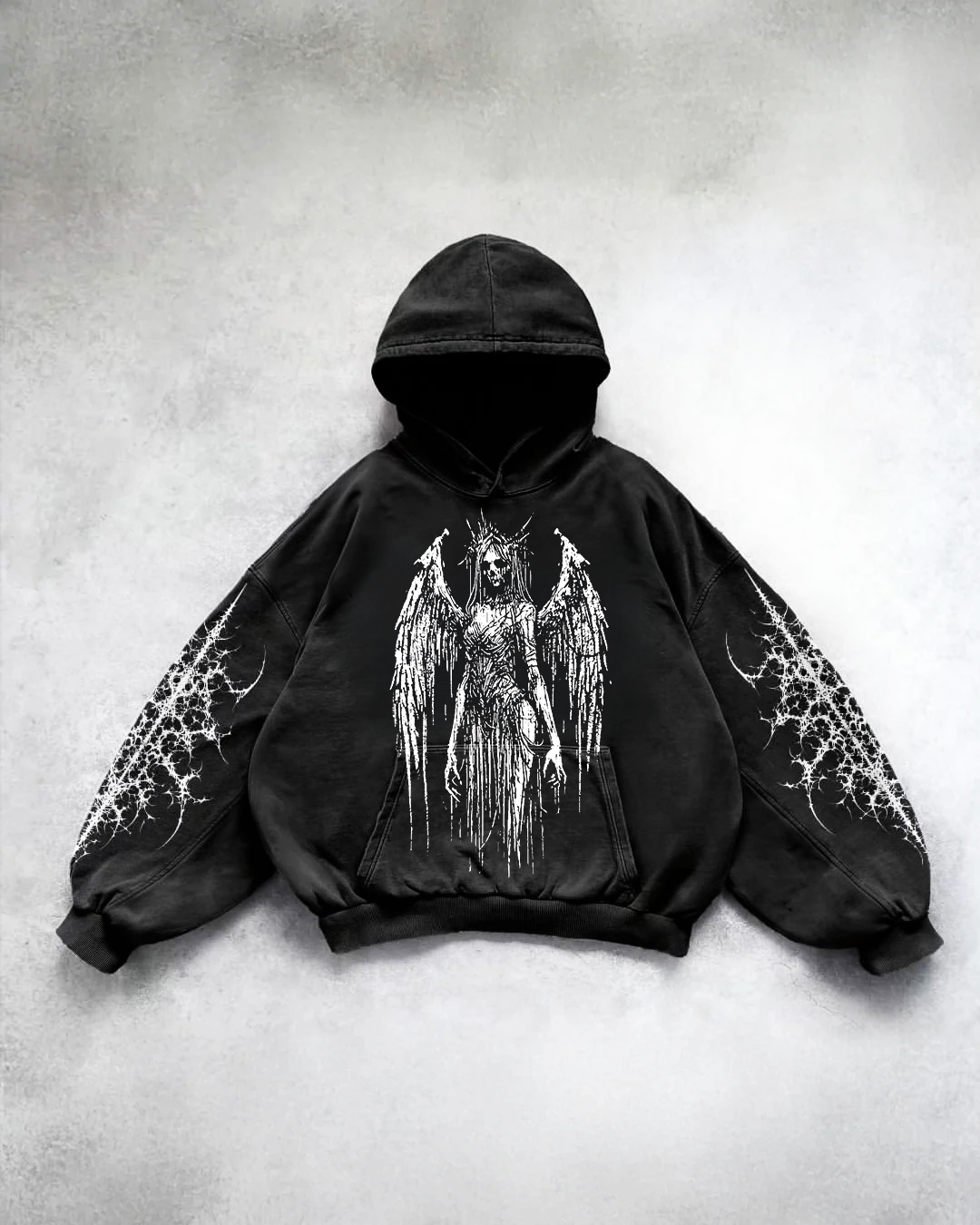 The Enchantress Hoodie feels like a dark spell woven into fabric. The front features a haunting winged figure—part celestial, part fallen—etched in detailed white ink that contrasts the deep black Color. Cracked web-like designs spread across both sleeves, symbolising power breaking through restraint.